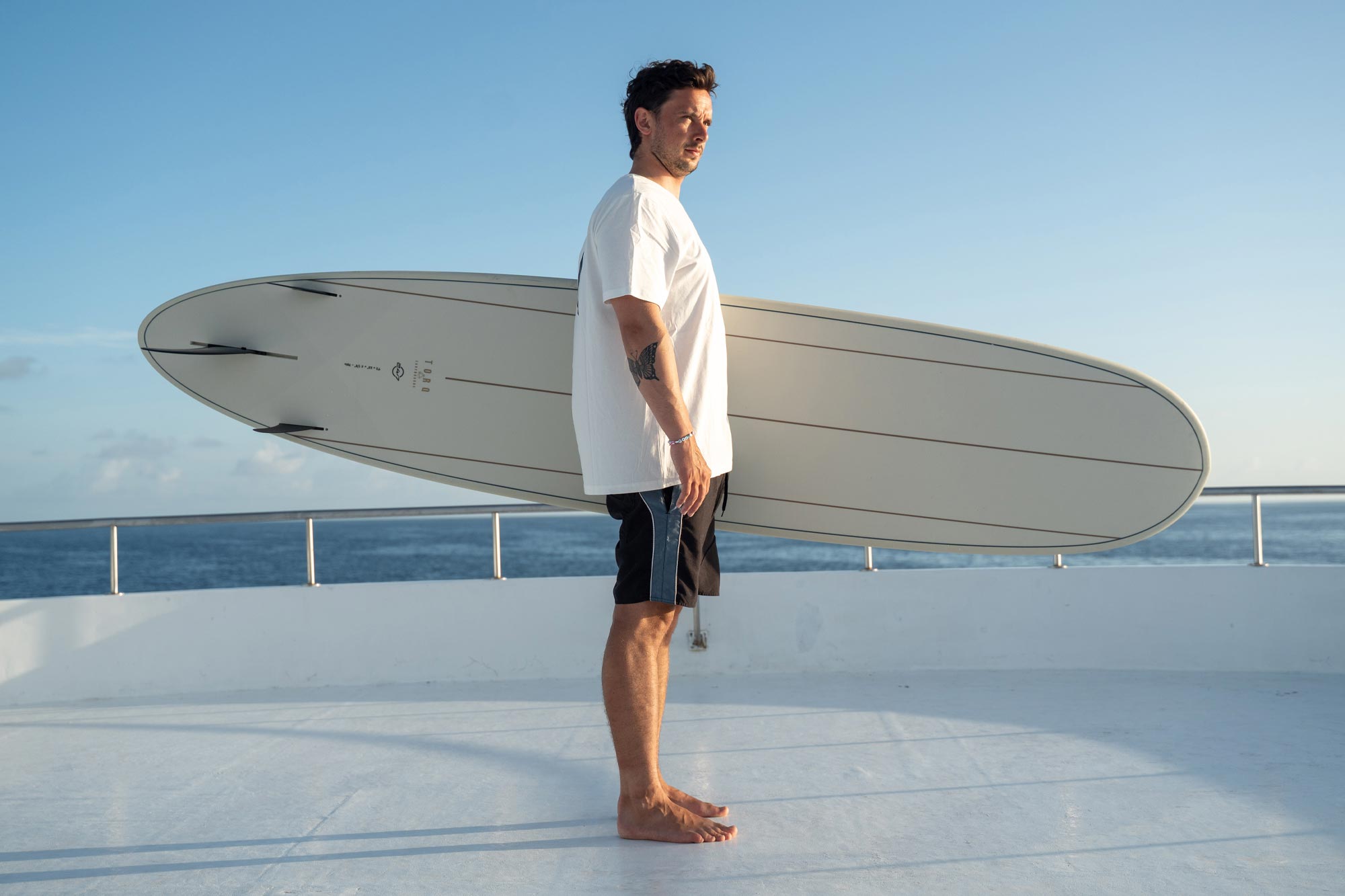 Shape wise, the 24/7 sits right in the middle between the nose riders and pro performers – a balanced outline with nose width for nose rides, a straight middle section for trim and a pulled in tail for turns and control in the pocket. The rocker matches the outline – low entry for stability, flat middle for speed and a flip in the tail for turns. There’s a good volume for max paddling, with a foiled rail through the fins and at the tail.